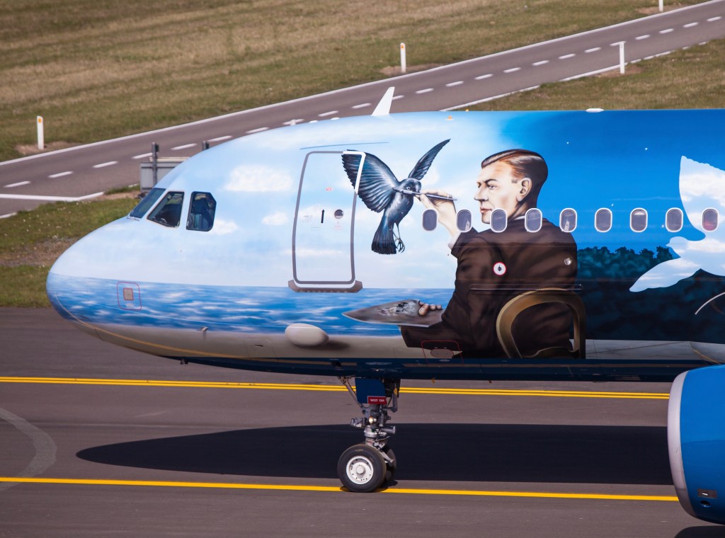 Zo had ik het voorrecht om van 2016 tot 2020 sporadisch te vliegen met een Airbus A320 die in een speciaal kleurenschema geschilderd was. Een vliegend eerbetoon aan de Belgische surrealistische kunstschilder René Magritte. Ik vond dit vliegend canvas oogverblindend. Het prachtig blauw kleurenpalet was als een camouflagepak dat tijdens hoge vluchten versmolt met een staalblauwe hemel. Aan de voorkant van het vliegtuig was een replica te zien van het schilderij “Clairvoyance” (1936). Volgens de gangbare verklaring uit de kunstwereld is dit werk een zelfportret van de schilder Magritte, die een ei bekijkt en vervolgens een vogel schildert. De schilder ziet de mogelijke toekomst: Magritte is clairvoyant oftewel helderziend… hence de titel van het werk: “Clairvoyance”.